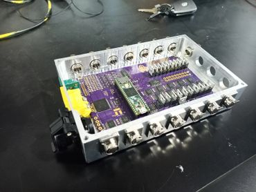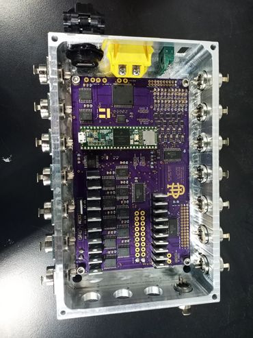 I designed the enclosure in Solidworks and machined the enclosure at home on my CNC and Mill. The mini XLR connectors provide a robust and modular locking connection to all solenoids, comms, and sensors within the rocket. The external USB port allows convenient post-installation programming and debugging. The NXP processor we chose allows for a 200KHz data log rate with comms enabled. The NXP chip was not integrated directly on the PCB in order to lessen development time and allow the processor to be easily swapped out.